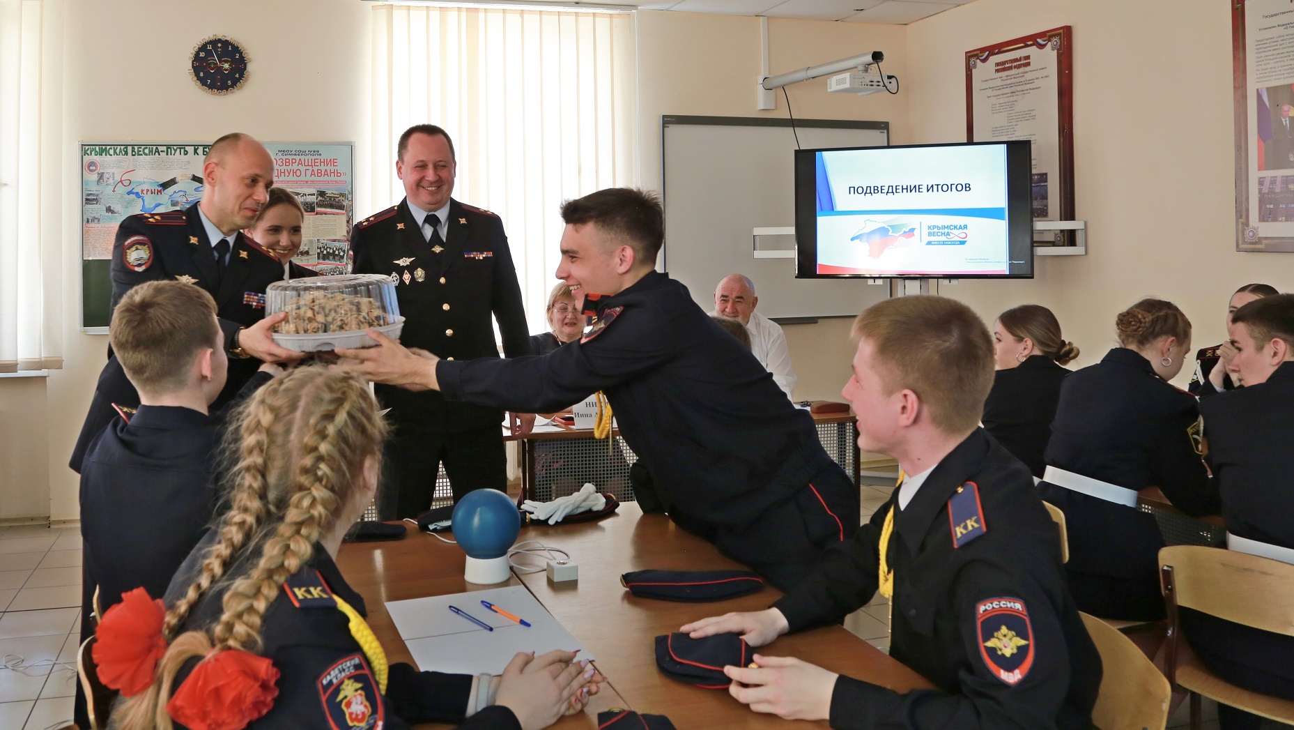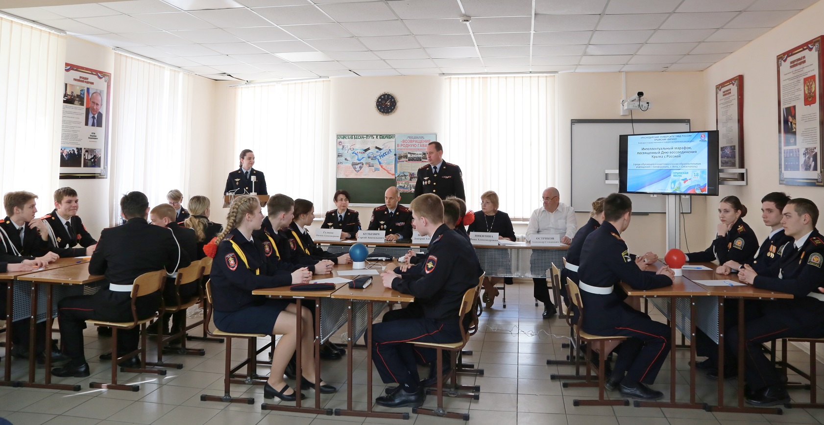 В рамках проекта «Кадетские игры», предусматривающего состязания интеллектуальной, спортивной и творческой направленности среди учащихся полицейских кадетских классов региона, в преддверии Дня воссоединения Крыма с Россией в Крымском филиале состоялась интеллектуальная викторина между командами средних общеобразовательных школ № 28 города Симферополя, № 6 города Севастополя и ялтинской гимназии № 11